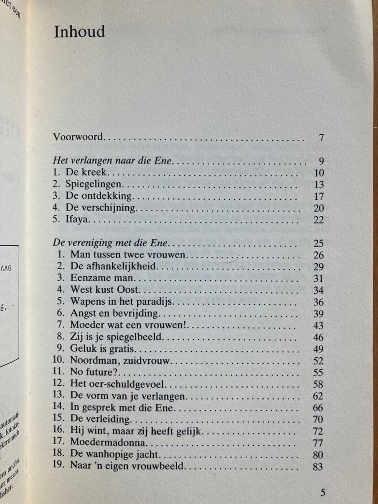 Iedere man draagt een beeld in zich van die ene ideale vrouw. Naar die vrouw is hij altijd op zoek. Waarom is dat zo en waar komt dat beeld vandaan? Wanneer hij een vrouw ontmoet die hem opwindt of ontroert. Doel iets in haar hem aan die ene ideale vrouw denken. Wordt hij verliefd op haar. Dan verwart hij de vrouw buiten en binnen hem met elkaar. Hij zal ontdekken dat de vrouw van zijn keuze toch niet aan zijn ideaalbeeld beantwoordt. Hij doet pogingen haar toch als dat ideaal te zien, prest haar iemand te zijn die ze niet is. Ten slotte verwijt hij haar dat hij niet heeft gevonden wat hij zocht, maar eigenlijk heeft hij geen contact kunnen krijgen met die ene vrouw in hemzelf. In dit boek wordt geprobeerd die ene innerlijke vrouw uit het duister tevoorschijn te halen om na te gaan wie zij is en wat haar invloed is op het leven van de man. Erkenning van en inzicht in die ene ideale vrouw kan de man helpen om op een nieuwe manier naar zichzelf in relatie tot de vrouw te gaan kijken en zich van zijn vrouwelijke helft in zijn vele facetten bewust te worden.