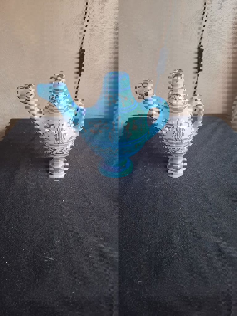 . Het bijzondere aan deze kameel is dat je een beetje van twee verschillende vloeistoffen door twee openingen kunt gieten (één bovenop de bult en de andere aan de onderkant van het aardewerk, door het ondersteboven te keren), en het mengsel vervolgens door de kop van de kameel kunt gieten!