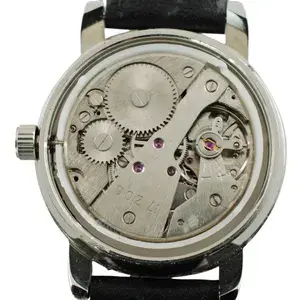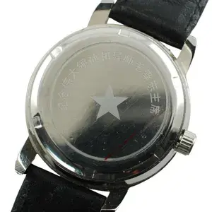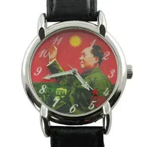 Dit vintage mechanische polshorloge heeft een foto uit 1966 van Mao Zedong, voormalig voorzitter van de Chinese Communistische Partij. Voorzitter Mao staat op het Tiananmen-rostrum met uitzicht op het Tiananmen-plein in Peking en is gekleed in een groen militair uniform met een Roodgardistische armband. Zijn rechterhand gaat ter begroeting omhoog. De achtergrond bevat een rode lucht en een gele zon op de 12-uurpositie. Het 17-steens uurwerk heeft een kenmerk waarbij de hand van Mao Zedong heen en weer beweegt in een zwaaiende beweging terwijl deze de tijd bijhoudt. De uren- en minutenwijzers lichten op in het donker en er is een rode ster aan het einde van de secondewijzer. Het horloge wordt geleverd met de originele zwarte band  leer'.